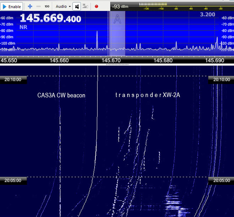 Это была двадцатка в телеграфе на КВ приёмнике. А ниже - транспондер XW-2A. Заметна работа компенсатора эффекта Допплера: наземная помеха стабильная по частоте превращается в параболу :-) Зато маяк спутника стабилен по частоте.