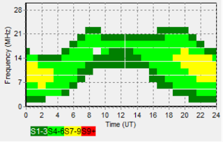 Самое скромное прохождение на КВ - на десятке. Она хиреет день ото дня. Но еще не умерла. С рассвета и до темноты там присутствует хотя и сильно фрагментированные, но многочисленные зоны хорошего прохождения. У кого есть хорошие антенны - туда можно заглядывать. С понижением частоты эти области становятся все больше и больше и уже на 15-ти метрах прохождение стабильно хорошее.