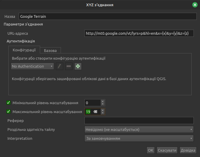 Представлення данихДля початку, конвертуємо оверлей назад в систему координат EPSG:4326 - WGS 84. Все, як в пункті 2, але в зворотньому порядку: як цільову СК вибираємо EPSG:4326 - WGS 84 або EPSG:3857 - WGS 84 / Pseudo-Mercator, якщо хочемо надалі накладати цей оверлей на карти Google Maps. Зберігаємо сконвертований шар як окремий GeoTIFF на диск, і тепер краще буде в QGIS створити новий проект. Шарів Google maps за замовчанням в QGIS немає, але іх не важко додати. Наприклад, додамо Google Terrain: в браузері (над панеллю з шарами) знаходимо XYZ tiles, клікаємо правою кнопкою, Створити з'єднання. Прописуємо назву, а в якості URL макрос https://mt1.google.com/vt/lyrs=p&x={x}&y={y}&z={z}. Ще ставимо Максимальний рівень масштабування 19. Все, решту не міняємо.